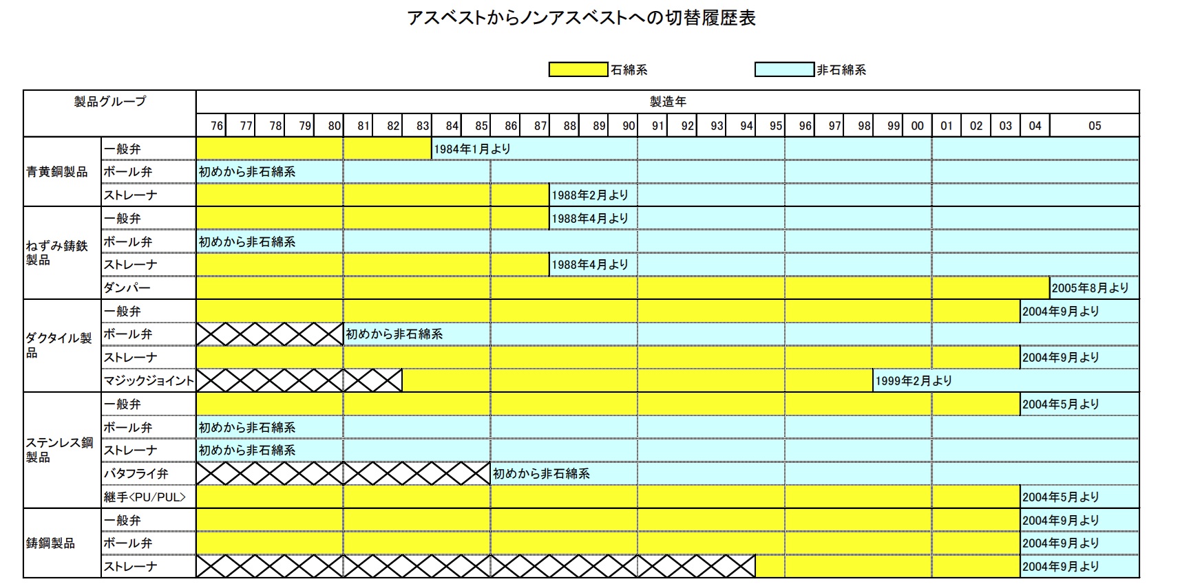 過去のアスベストからノンアスベストの切替時期については下記資料をご参照ください。