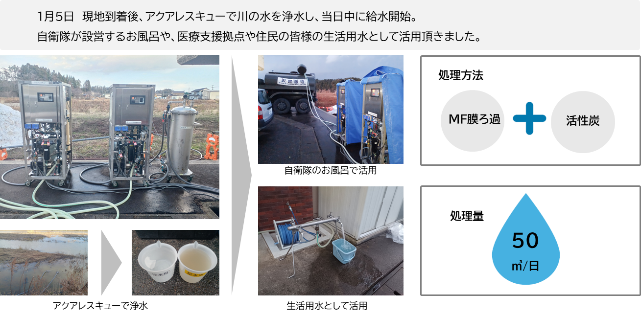 周囲の川の水を原水として、「アクアレスキュー」で処理した水を、自衛隊が避難所に設置したお風呂の水や生活用水として活用いただきました。その他多数の自治体で採用され、常設・非常用の両用途で活用されています。