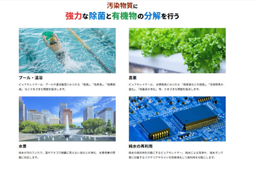 「ピュアキレイザー」は、オゾン、紫外線、光触媒を組み合わせて水を除菌・浄化する水処理装置です。水循環や流体の再利用など、水に関するさまざまな課題解決に貢献します。工業用水の再利用をはじめ、農業用水、プール・温浴施設の水質改善など、幅広い用途でご活用いただけます。
